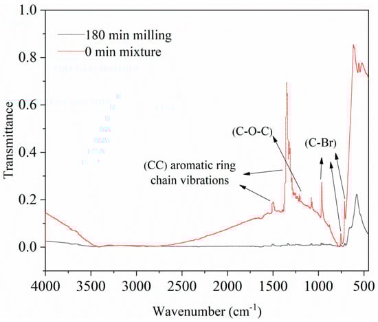 The samples, both before and after MC treatment for 180 min, were prepared for FT-IR analysis. The spectra in Figure 6 offer valuable insights into the structural and functional properties of the milled samples. In non-milled samples, the peaks at 1499 and 1321 cm−1 represented the chain vibrations of the aromatic ring, while the peaks at 962, 763, and 695 cm−1 were attributed to the stretching vibration of the C-Br bond. Additionally, the peak at 1210 cm−1 denoted the asymmetrical stretching vibration of the C-O-C bond in BDE 209 [43]. Interestingly, all the abovementioned peaks disappeared in the 180 min ball-milled sample, suggesting that BDE 209 was degraded completely, and the bromine was removed from the organic structure. These observations align with the findings from the degradation and debromination experiments.
