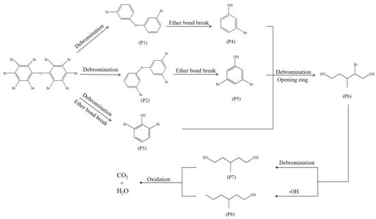 Polybrominated diphenyl ethers (PBDEs) have been widely used as brominated flame retardants in manufactured products, such as plastics, construction materials, textiles, and electronic equipment [1,2,3,4]. Decabromodiphenyl ether (BDE 209) is one of the commercial PBDEs found worldwide [5,6]. However, BDE 209 is one of the typical persistent organic pollutants (POPs), with characteristics of long transportation range and environment persistence, due to its indestructible chemical bonds making it difficult to be decomposed [7,8]. Previous studies have consistently found BDE 209 in different parts of the environment, such as air, water, soil, and sediment [9,10,11,12,13]. Moreover, due to its high lipophilicity, BDE 209 can be accumulated in biological organisms and eventually transferred to humans through the food chain. It has been reported that BDE 209 exposure might lead to neurotoxicity, endocrine disruption, and carcinogenicity [14,15]. Thus, the elimination of BDE 209 has been currently capturing increased attention worldwide.