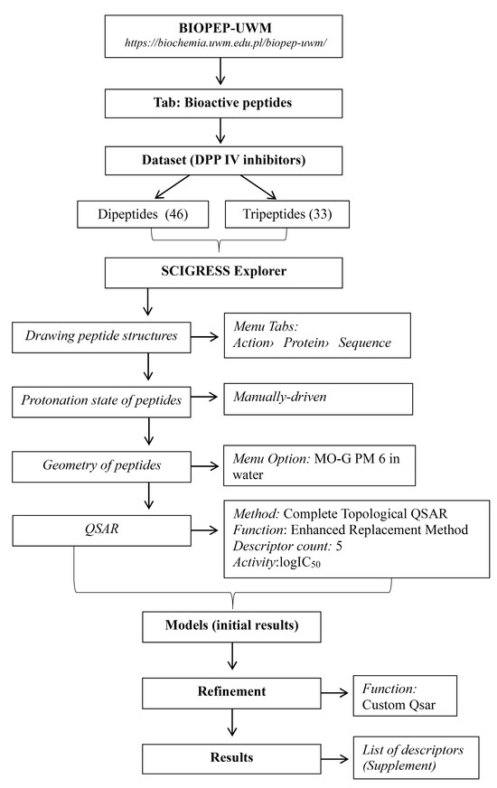 The procedure of QSAR modeling of di- and tripeptide DPP IV inhibitors using BIOPEP-UWM database (see Section 2.1) and SCIGRESS Explorer: Version FJ 3.5.1 is shown in Figure 1.