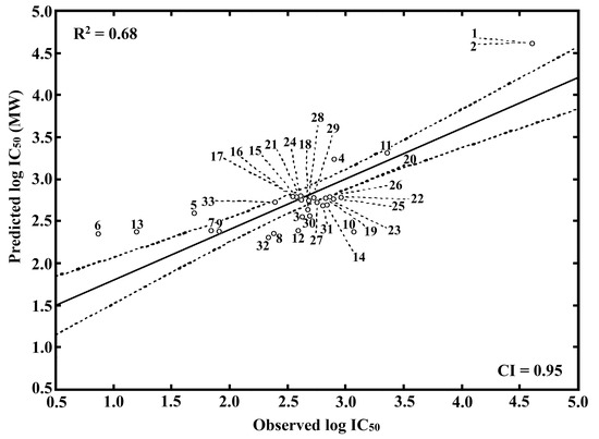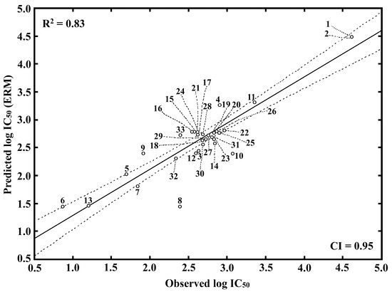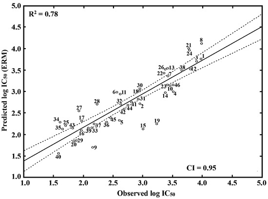 Comparison of Figure 4 and Figure 7 shows that the prediction of log IC50 based on a wider variety of descriptors provides better correlation between predicted and observed values than the calculation taking into account predictors associated with molecular weight only. Log IC50 (ERM) reveals a better correlation with experimental results than log IC50 (MW).