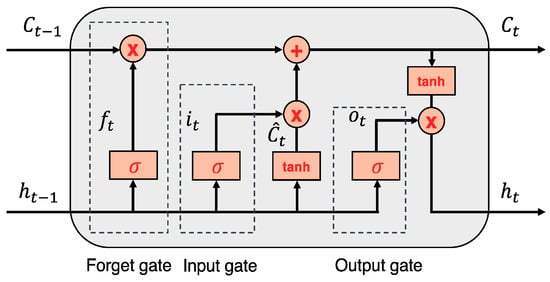 The RNN approach is commonly utilized by practitioners in forecasting studies within the ML models due to its acceptable performance with sequential data []. However, despite its capacity for processing short-term sequential data, the RNN’s success appears unsatisfactory when learning long-term dependencies or prolonged context memorization is desired in time-series forecasting applications. LSTM is an improved version of RNN that has been developed to effectively learn long-term dependencies of time series data while mitigating the effects of ‘vanishing gradients’ or ‘exploding gradients’ through its memory cell and gate structures. These distinguishing features set it apart from traditional RNNs []. Figure 1 provides an illustration of the LSTM architecture. The memory cell (Ct) records neuron states at time t, while selected information passes through gates that employ a sigmoid neural layer and point-by-point multiplication system. LSTM achieves information conservation and supervision via the forget gate (ft), input gate (it), and out-put gate (ot) mechanisms. The forget gate determines whether to retain or eliminate previous information from the cell state Ct−1 using a sigmoid function, and the output of this gate (ft) at time t is computed as follows.