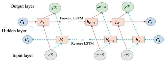 In the LSTM model, data is transmitted in one direction, conveying historical information []. Conversely, the Bi-LSTM model enables bi-directional data flow, transferring information about both the past and future. As a result, Bi-LSTM features two distinct hidden layers that are connected to the same input and output []. One of the hidden layers in Bi-LSTM consists of a forward LSTM that transfers historical data from the input sequence to the output sequence. Simultaneously, the other backward LSTM moves future data information from the output sequence to the input sequence. This mechanism enables the model to learn long-term dependencies and enhance its accuracy []. Bi-LSTM architecture is given in Figure 2. Here, the hidden state of Bi-LSTM at time t comprises forward and backward , while Ht denotes the final hidden output of Bi-LSTM, which results from combining the forward and backward outputs. Technical terms are explained upon their initial usage to ensure clarity []:
