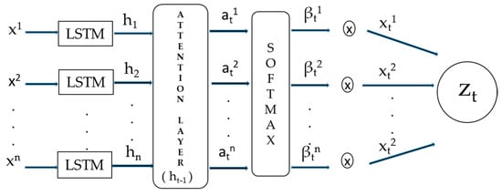 Afterwards, the initial input features of xt are substituted with the zt obtained from here, which leads to the update of the attention model. The end result of zt becomes the novel input of the LSTM-DL model. Thanks to the attention weight, redundant feature sequences can be excluded, while important input feature sequences can be emphasized. The model’s process flow is depicted in Figure 3 below [].