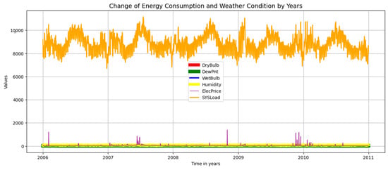 Since the goal of the study was to estimate the medium-term (one month ahead) load, the half-hourly load data were first converted to daily data. At this stage, the sum of all values of each characteristic for a day was resampled and 1827 days of load observation data were obtained. In order to obtain a more stable prediction result, the data to be processed by the model must have integrity and be normalized. For this purpose, the data used was first checked for null fields and it was found that there were no missing data. To visualize the dataset, Figure 4 and Figure 5 show the change in electricity consumption over the years based on all features and each feature in the dataset, respectively.