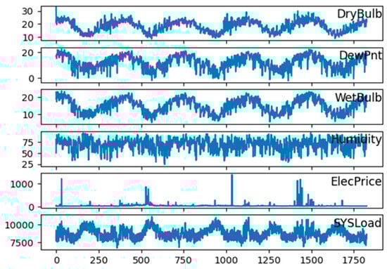 The dataset aggregates data from diverse load types in Australia, covering dates ranging from 1 January 2006 to 1 January 2011. It comprises six distinct features, namely electrical load consumption (‘SYSLoad’), the dry bulb temperature (‘DryBulb’), the dew point temperature (‘DewPnt’), the dry bulb temperature (‘WetBulb’), humidity, and electricity price (‘ElecPrice’). The target variable is the electrical load consumption values, represented by ‘SYSLoad’. All variables, except for ‘ElecPrice’ depict the climatic information. ‘ElecPrice’ can be obtained from the Australian Electricity Market Operator (AEMO).