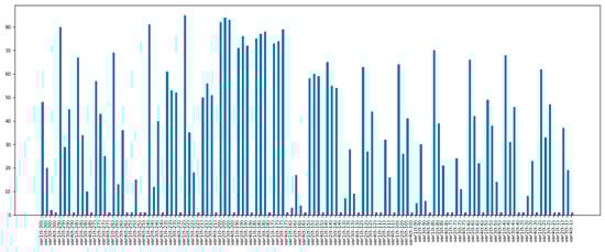 Time lag for features was implemented for the ‘DryBulb’, ‘WetBulb’, ‘ElecPrice’, and ‘SYSLoad’ features from the previous feature selection step. Accordingly, the values of each of the four features from 30 days ago to time t and the values of the target variable, the ‘SYSLoad’ variable, from time t to 30 days later became the new features to feed into the model. The number of these features, in other words the number of columns, was found to be 150 (120 input, 30 target) features. However, since the number of 120 input features would increase the computation time of the model and cause the complexity of the model, the RFECV method was applied again and the most necessary features were determined, as a result, the 120 input features were reduced to 36. Therefore, as a result of the selection of important lags, the number of input features to be given to the models used was obtained as 36. Figure 8 shows a bar chart of the final lag values fed to the model, and the short bars indicate the most effective lag values among all the lag values. In this figure, var1: DryBulb, var2: WetBulb, var3: ElecPrice, and var4: SYSLoad, and the short bars indicate the most effective lag values among all lag values.