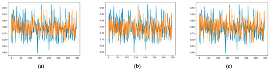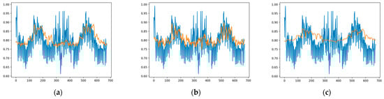 Figure 9 shows the one-month-ahead prediction results of Model1, Model2, and Model3, respectively, for test data in the Subset1 dataset. In this figure, the blue and orange lines indicate the actual load values and the predicted values, respectively. By analyzing the figure, it can be inferred that Model2 provides the best approximation of the actual load value using the Subset1 test data.