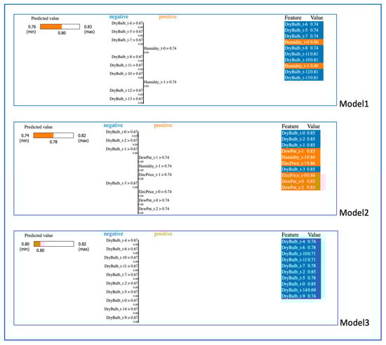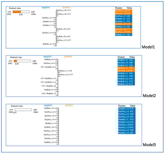 Figure 12 shows a visualization of the results of LIME when Model1, Model2, and Model3 use Subset2, respectively. The XAI results for Subset2 in the figure were obtained using the random second sample in the test set for all models. Looking at the results of Model1 here, we can see that the prediction score of Model1 is 0.79 and the parameters that have a positive effect on this score are the lagged values for the 27th, 28th and 29th days of ‘ElecPrice’ and the lagged values for the 28th and 29th days of ‘DryBulb’. In addition, recent lagged time values of ‘DryBulb’, ‘ElecPrice’ and ‘WetBulb’ negatively affect the prediction of the model. It can be seen that the prediction result for Model2 is 0.78, and while the lagged values for the 1st and 23rd day of ‘ElecPrice’ have a positive effect on the result, the lagged values of the remaining variables colored in blue on the right side of the figure for Model2 have a negative effect. For Model3, the predictive score is 0.77, and all of the variables listed on the right side contribute negatively to the model reaching this minimum predictive score. Summarizing the overall situation for Subset2, where three features were selected from the first five features of the dataset and prepared by taking all the lagged values of these features up to 30 days, it can be inferred that determining the lagging range based on 30 days is the right step because the lagged values of the selected features going back further strengthen the prediction of the models. In addition, ‘DryBulb’ and ‘ElecPrice’, which are the most effective features for Subset2, improve the model in real terms, so an effective feature selection can be achieved.