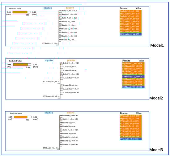 Figure 14 shows a visualization of the LIME results of the predictions made with Model1, Model2, and Model3, respectively, using Subset3. The XAI results for Subset3 were obtained using a random first sample in the test set for all models. As can be seen from the LIME results, the prediction of Model1 is 0.89, and many time-lagged values of the ‘SYSLoad’ feature and a one-day lagged value of the ‘DryBulb (t-1)’ feature in the right figure contribute positively to the prediction score. The predictive value of Model2 is 0.88, and as in Model1, the ‘DryBulb’ and ‘SYSLoad’ features have a positive impact on this prediction result. While the values of the ‘DryBulb (t-1)’, ‘SYSLoad (t-20)’, ‘SYSLoad (t-13)’, ‘DryBulb (t-7)’ features positively improve the prediction of Model2, the ‘SYSLoad (t-17)’ and ‘SYSLoad (t-18)’ features have a negative effect. The prediction value of Model3 is 0.90, and the features that contribute positively to this model are the values of the ‘DryBulb’ and ‘SYSLoad’ features, as in Model1 and Model2. As shown in the table, the values of ‘SYSLoad (t-13)’, ‘SYSLoad (t-5)’, ‘SYSLoad (t-6)’, ‘SYSLoad (t-7)’, ‘SYSLoad (t-13)’, and ‘SYSLoad (t-20)’ contributed the most to the prediction of Model3. When the XAI results from Subset3 are evaluated on a feature basis, it can be inferred that the most effective features are ‘SYSLoad’ and ‘DryBulb’.