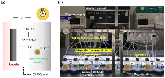 (a) Schematic diagram of photosynthetic electrotreatment and (b) illustration of the photosynthetic two-chamber electrochemical cell system used in this study, equipped with a power supply, light source, magnetic agitation, and aeration control to stimulate astaxanthin accumulation in Haematococcus lacustris. The diagram was modified from Fitriana et al. [25]. DC, direct current; LED, light-emitting diode; ROS, reactive oxygen species.