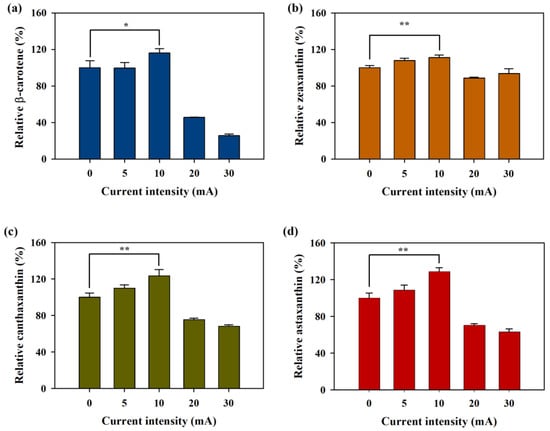 Effect of current intensity on the relative contents of β-carotene (a), zeaxanthin (b), canthaxanthin (c), and astaxanthin (d) of Haematococcus lacustris electrotreated for 4 h under different current intensities (5, 10, 20, and 30 mA) compared to those of the untreated controls. The relative content (%) of each carotenoid pigment is presented compared to that of the untreated control (100%). The error bars represent the standard deviations of four samples. * p < 0.05 and ** p < 0.005.