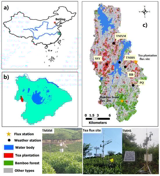 Our study area (Tianmu Lake catchment (Figure 1c)), positioned in southeast China, is placed in the western headwater region of Taihu Lake Basin (Figure 1). It enjoys a subtropical monsoon climate characterized by 2 major rainy seasons (April to September) and a dry season (October to March). Annual precipitation and average air temperature are 1147 mm and 15.8 °C, respectively. The precipitation in the rainy season accounts for 75% of the annual total precipitation, and the lowest and highest temperatures occur in January (3.1 °C) and July (28.4 °C), respectively. Tianmu Lake catchment has also experienced rapid tea plantation expansion accompanied by dramatic land use cover changes in the last two decades (Figure 1). The area of tea plantations obviously increased from 2006 to 2013, reaching 28.6 km2 in 2013, accounting for 11.7% of the catchment area. Although Tianmu Lake catchment experiences a sub-tropical climate, drought occurs frequently in the growing season. Hence, it is vital to develop accurate ETa estimations for crop water management in the tea plantations. In our study area, the tea plantations are planted with a density of 45,000 plants ha−1 with an inter-row spacing of 1.5 m. Figure 1 and Table 1 present the general schedule of phenology and the biophysical parameters for the tea plantations.