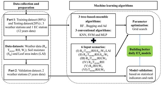 Given their flexibility and reliability in data pattern recognition, machine learning techniques have elicited considerable attention in various fields [36,37,38]. In recent years, this has included automated machine learning [39], biological process modeling [40], smart city planning [41], and precision agriculture [42]. Various machine learning methods, which have been proven to be effective tools in data mining tasks, exist in the literature. To provide an efficient tea plantation ETa evaluation model, six widely used machine learning methods, namely, KNN, SVM, RF, MLP, Ada, and bagging, were applied to the estimation of the tea plantations’ ETa in the current study. The data processing and model building of this study are shown in Figure 2. The machine learning algorithms are briefly described in the succeeding subsections.