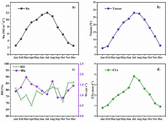Average monthly distributions of Rn (a), Tmean (b), RH, Ws (c), and ETa (d) of the study area.