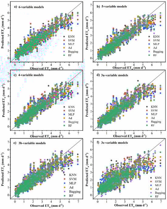Predicted ETa versus observed ETa using six machine learning algorithms with six input scenarios in the validation phase.
