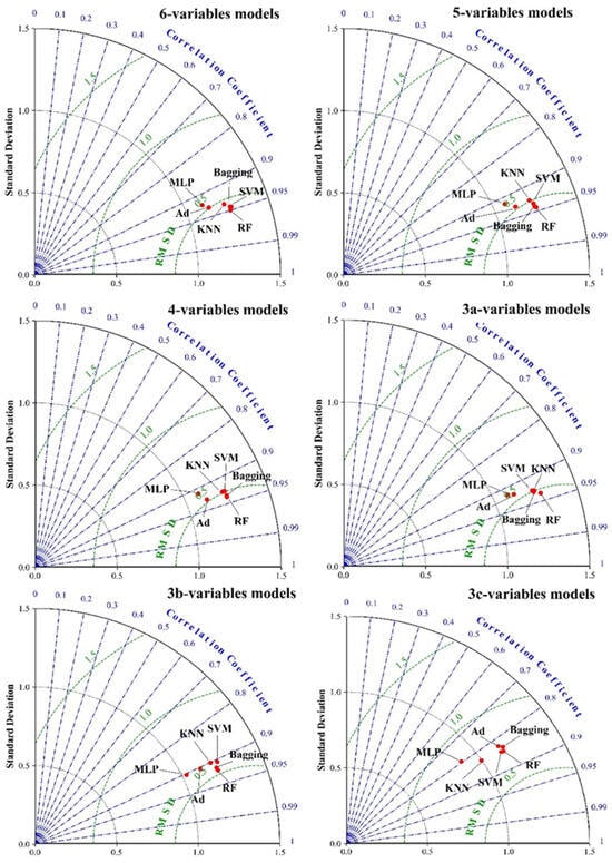 Taylor diagrams for the considered machine learning algorithms (RF, bagging, SVM, KNN, Ad, and MLP) for different input data scenarios.