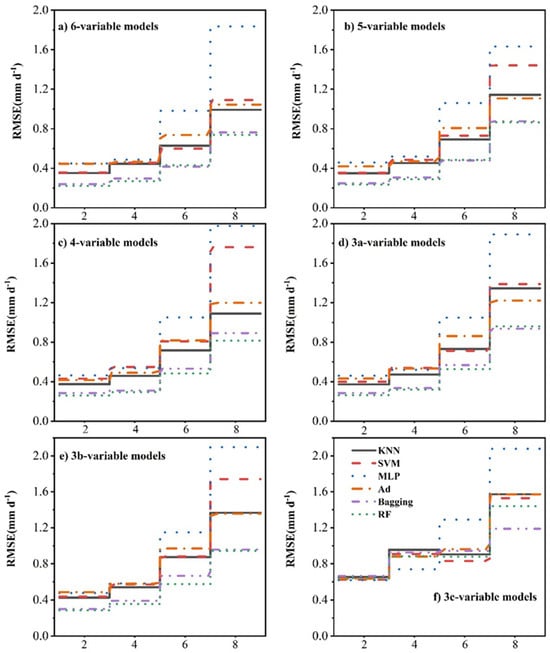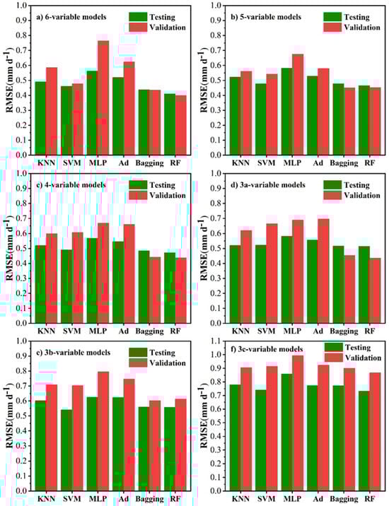 Figure 6 shows the average RMSE of all machine learning algorithms in our study during the validation and testing phases under six input scenarios. The results show that RF and bagging models exhibited improved steadiness with low RMSE values increasing in the validation phase over the testing phase. By contrast, MLP was the worst-performing model compared with the Ad, KNN, SVM, bagging, and RF models. The RF and bagging models reliably demonstrated the lowest percentage increase (−15.3% to +18.5%) in validation-phase RMSE over testing phase RMSE among the six machine learning algorithms, suggesting that the RF and bagging models would considerably improve the prediction accuracy when using new climate datasets with high stability. Our results are consistent with the outcomes of [32]. They also reported that the RF model presented a lower increase in testing RMSE from 0 to 49% in the validation phase over the testing phase. The authors of [68] revealed that RF exhibited high performance in evapotranspiration estimation by using the FLUXNET2015 dataset. However, the results of our study disagreed with those of [69], who reported that the RMSE increase rate for the bagging model in the test phase was typically higher than the rates for other machine learning models. Moreover, EL algorithms, including bagging, RF, and Ad, exhibited inferior performance in regression problems due to the impaired ability to provide a constant output [69]. In our study, however, the RF and bagging models displayed good stability with a satisfactory percentage increase, wherein the decision tree might provide more weight for points that were not predicted using the previous predictor and finally reserved the weighted voting right to overcome the estimation difficulty of overfitting [70]. However, the ensemble model Ad could not produce good prediction accuracy in our case. In particular, in the 6–8 mm day−1 range (early-growing and mid-growing seasons), it had a higher RMSE than the RF and bagging models (Figure 7 and Figure 8). This result was largely due to the high sensitivity to “abnormal samples” of Ad during that period (high plant physiology limits), which obtained a high weight in iteration, affecting the prediction accuracy of the final strong learner. This phenomenon was also documented by many researchers who used the Ad model to resolve regression problems in hydrology and agriculture studies [71,72].
