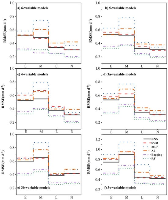 The levels of accuracy in different estimation ranges and seasons of daily tea plantation ETa were assessed (Figure 7 and Figure 8). The range of daily ETa observed values in the validation phase was divided into four sub-intervals: 0–2, 2–4, 4–6, and 6–8 mm day−1. Meanwhile, the performance of different seasons, i.e., the early-growing season (E), mid-growing season (M), late-growing season (L), and non-growing season (N) with different estimation ranges of ETa, were also investigated. All models presented the highest RMSE values in the sub-interval of 6–8 mm day−1 (Figure 7). Except for the RF and bagging models, RMSE was always above 1.0 mm day−1 for the other models in the sub-interval under all the scenarios. It even exceeded 1.5 mm day−1 for the MLP model. In Scenarios 5 and 6, RMSE values even exceeded 2.0 mm day−1 for the MLP model (Figure 7e,f). By contrast, in the sub-intervals of 0–2 mm day−1 and 2–4 mm day−1, all the models had a higher prediction accuracy (RMSE < 0.6 mm day−1, except for Scenario 6, Figure 7f). In general, the RF and bagging models exhibited the highest stability with a lower RMSE increase (RMSE < 0.32–0.81 mm day−1) than the other models at all sub-intervals. At the seasonal scale, except for the RF and bagging models, the other models also had higher RMSE (0.5–1.2 mm day−1) in the early-growing and mid-growing seasons, which increased from 31% to 137% relative to the RF and bagging models. In other seasons, except for Scenario 6, the RMSE of all the models was within 0.5 mm day−1. Meanwhile, the differences in RMSE values between the RF and bagging models were within 10%. These results also suggest that the tree-based EL (RF and bagging algorithms) exhibit good potential for tea plantation ETa estimation with a higher stability.