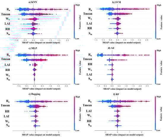 The contributions of the influencing factors on the predicted daily ETa from the studied models were assessed using the Shapley value. Figure 9 displays the key statistical parameters for the six machine learning models by using the whole dataset (Scenario 1) in the validation phase. All models consistently detected Rn as the most vital factor. Meanwhile, a positive correlation relationship between daily ETa and Rn was also found. In addition, Tmean also made a high contribution to tea plantation ETa estimation for all machine learning models. By contrast, the contributions of other features varied in the different models. In the KNN and SVM models, Ws was the third important feature, and the effects of the remaining features were considerably smaller. For MLP and RF models, LAI was the third important feature. Meanwhile, RH was the third important feature for the Ad and bagging models. However, the importance of LAI and RH also decreased significantly. The contribution of Sm was considerably less of a feature for all models in our study. The results suggested that energy conditions (Rn and Tmean) are the key drivers for tea plantation ETa estimation. This finding agreed with those of previous studies, which reported that solar radiation and temperature are the most important climatic variables that influence ETa variation in different ecosystems in humid regions [6,68]. Meanwhile, this finding was further supported by observation studies that used eddy covariance, which implied that Rn acted as a primary driver of evapotranspiration in tea plantations and determined the temporal variation in ETa by more than 70% for tea plantations in our study area [5,6]. These results also suggest that the models that used machine learning methods in our study possess a certain physical mechanism for the ETa estimation of tea plantations.