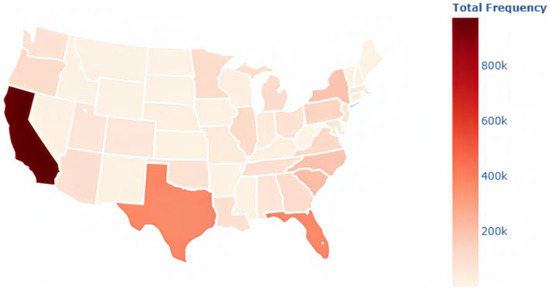 The case data used in this paper are derived from the National Traffic Accidents Data Set, which covers 49 states in the United States from 2016 to 2023 and uses several APIs that provide streaming traffic accident data. Figure 2 shows the current data distribution over all the states. These APIs broadcast traffic data collected by a variety of entities, including U.S. and state departments of transportation, law enforcement agencies, traffic cameras, and traffic sensors on the roadway network [38,39].