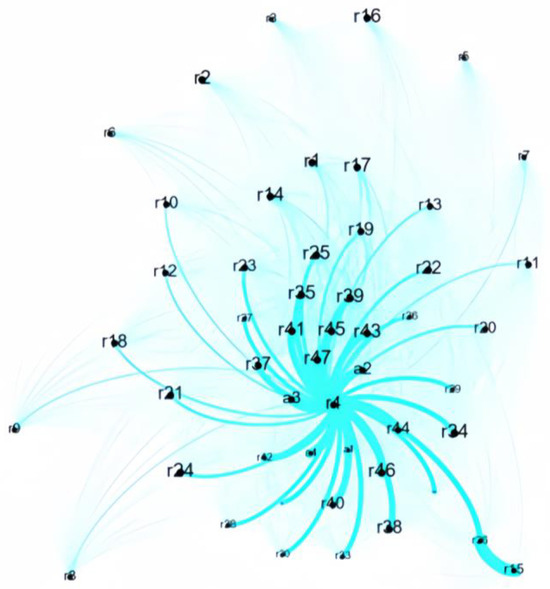 The target matrix is entered into the Gephi platform and adjusted to form a complex network model using uniform layout. At the same time, the weights of nodes and edges are assigned accordingly.