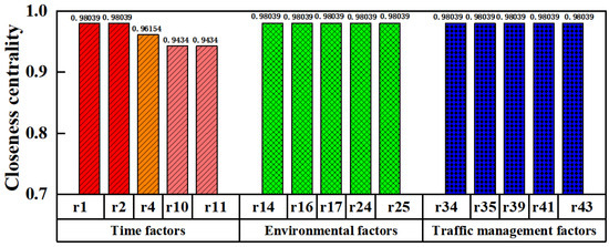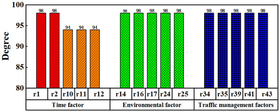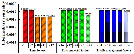 From Figure 6, it appears that the day, night, and season hold a high level of intermediary centrality in terms of time factors. With respect to environmental factors, the intermediary centrality of environmental humidity and visibility during accidents is high. Among traffic management factors, intersections, stop signs, and no deceleration signs have a high degree of intermediary centrality.