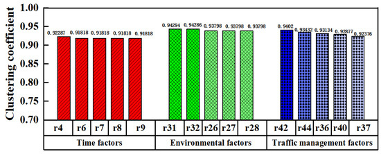 From the perspective of the time factor, the clustering coefficient on Tuesday, Thursday, Friday, Saturday, and Sunday is higher. In terms of environmental factors, the clustering coefficient is higher for severe weather such as sandstorms and hailstone, as well as clear sky and cloudy and foggy sky. In terms of traffic management factors, the presence of road safety measures, stations, and speed bumps was highly correlated with other accident factors.