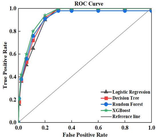 As shown in Figure 10, it can be seen that the Extreme Gradient Boosting (XGBoost) curve is closer to the upper left corner than the other three model curves. It means that Extreme Gradient Boosting (XGBoost) has a larger AUC value, and its performance is also better than the other three methods. Therefore, the performance of Extreme Gradient Boosting (XGBoost) is superior to that of the other three models.