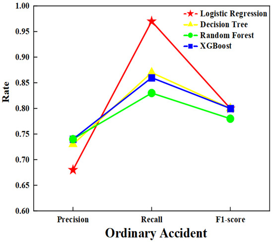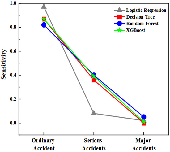 From the sensitivity test in Figure 14, it can be seen that all four models can effectively and correctly classify accidents in Ordinary accidents. In Serious accidents, the classification performance of Extreme Gradient Boosting (XGBoost) and Random Forest (RF) is higher than that of Logistic Regression (LR) and Decision Tree (DT). In Major accidents, the classification performance of the four models for accidents is relatively low, due to the small amount of data for Major accidents and the insufficient learning depth of the models for various features.