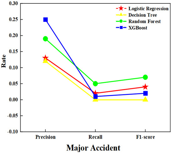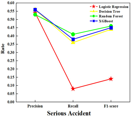 From the above Figure 11, Figure 12 and Figure 13, we can see that the precision rate, recall rate, and F1-score value of the four models are larger in Ordinary accidents and Serious accidents. The reason is that the number of Ordinary accidents and Serious accidents in the original data accounts for a large proportion. It can be seen that when considering the safety triggering factors, it is possible to focus on the influencing factors of both Ordinary and Serious accidents.