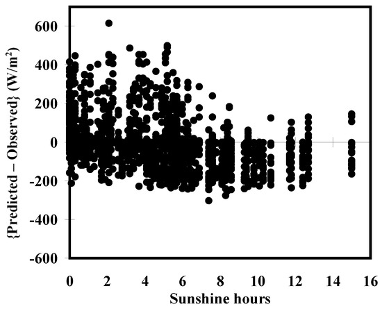It is evident from Figure 2 that both versions of the model work better for long sunshine duration and high daily solar flux. This is not surprising since such conditions are equivalent to less cloud cover, reducing the uncertainty in cloud cover estimation. Hence, one can conclude that the model works better for clear-sky conditions.