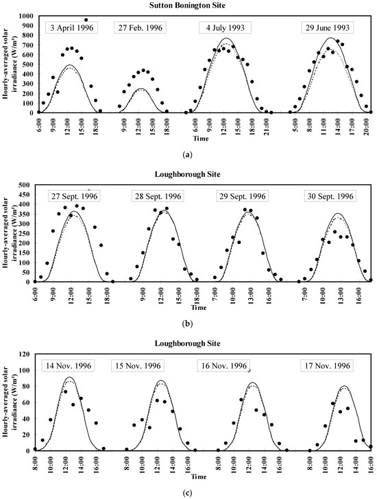 Time series (on daily basis) of modelled (curves) and measured (data points) solar irradiance at the following: (a) Sutton Bonington site on 3 April, 27 February, 4 July and 29 June 1996 (in no particular order); and Loughborough site on (b) 27–30 September 1996 and (c) 14–17 November 1993. In each case, two sets of modelled results are plotted; one set is generated by the first version of the solar radiation model (Model 1), corresponding to the full-line curves, and the other set by the second version (Model 2), which corresponds to the dotted-line curves.