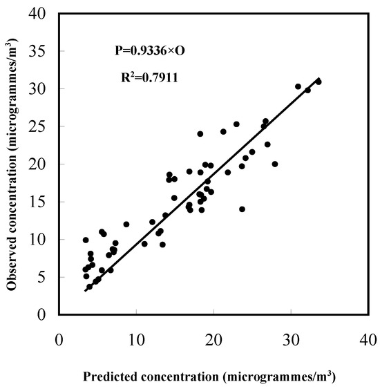 Scatter plot of observed (measured) against predicted (modelled) vehicle-generated airborne particle concentration in a street canyon, including the statistical outcomes of the linear regression analysis.