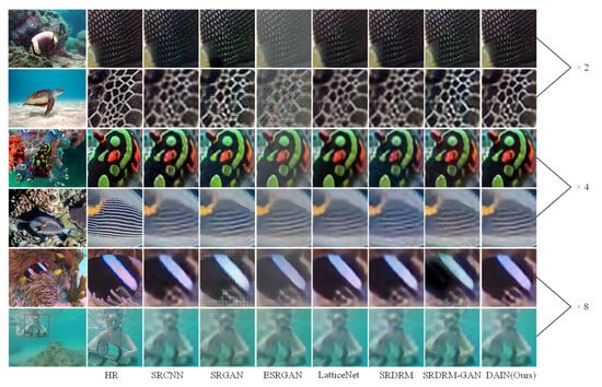 Visual comparisons between our DAIN and popular methods were conducted utilizing the USR-248 dataset for scale factors of ×2, ×4, and ×8. Left to right: the original HR image, SRCNN, SRGAN, ESRGAN, LatticeNet, SRDRM, SRDRM-GAN, and the proposed DAIN.