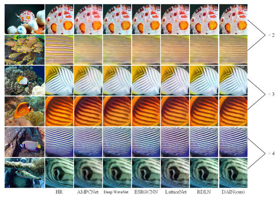 In the case of Table 2, our proposed DAIN demonstrates competitive performance, particularly achieving the highest values in terms of PSNR. Our DAIN is slightly inferior to Deep WaveNet in terms of SSIM and UIQM, but the gap is at most 0.05. The quantitative results of AMPCNet lag far behind our method. Compared with transformer-based methods such as URSCT and RDLN, our method yields a 0.42 dB improvement in PSNR at the scale factor of ×2. In the case of ×4, our DAIN has better performance, obtaining a 0.06 increase in SSIM compared to URSCT. Additionally, the DAIN does not surpass the RDLN in terms of UIQM, but the margin is 0.02 at a scale factor of ×4.