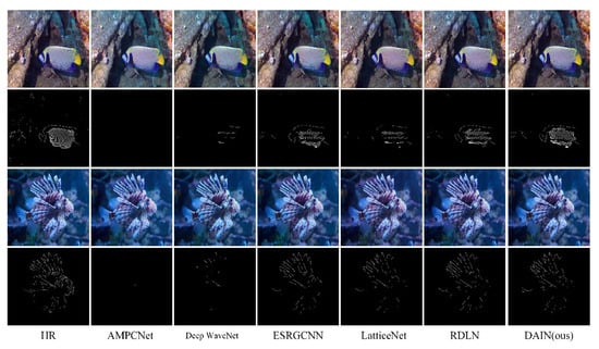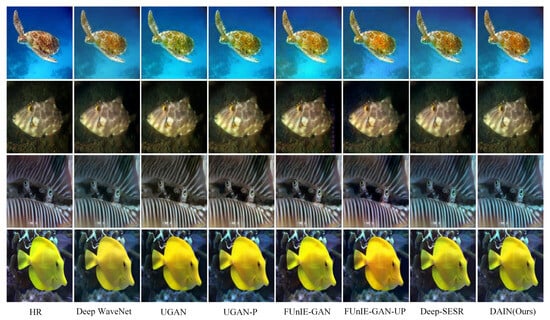 To further show the robustness and effectiveness of the proposed DAIN, we performed enhancement experiments on the EUVP dataset and compared our model with models including UGAN [], UGAN-P [], Funie-GAN [], Funie-GAN-UP [], Deep SESR [], and Deep WaveNet []. EUVP consists of 11,435 pairs of underwater images for training and 515 pairs of samples for testing. They follow the standard procedures [,] for optical/spatial image degradation and use manually labeled saliency mappings to create pairs of data.