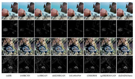 As global pressure on land-based resources continues to grow, increasing attention is beginning to be focused on the oceans and seas as an important source of natural resources. The oceans cover the vast majority of the Earth’s surface, which contains rich biodiversity, energy potential, and mineral resources. However, due to complex factors such as scattering, absorption, and color deviation of light in underwater environments, the quality of underwater scenes is significantly degraded. To address these challenging issues, many methods [,,,,,] have been developed to improve degraded image quality. In the beginning, people tended to make more elaborate filters to recreate as many images as possible captured in underwater environments, largely inspired by the theory of the human retina []. Later, physical models were often used to mimic the respective complex environments in real scenarios []. In addition to this, they also used a priori methods to globally enhance the picture []. Image super-resolution (SR) techniques are designed to restore high-resolution (HR) images from low-resolution (LR) images, which can restore the details and clarity of the images and improve the visualization and application of underwater images. Although the image improvement of these methods performs well in some specific contexts, it may suffer from poor performance when dealing with complex, dynamic, and variable real-world images.