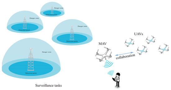 In this study, a Unity-based experimental platform was employed to simulate the surveillance task of unmanned aerial vehicles (UAVs) offering a rich canvas for insights. UAVs, as symbols of automation and intelligence, require nuanced interactions with human operators, especially in high-stakes conditions where the degree of trust becomes a key factor for collaboration success [54,55]. The experimental setup created in Unity simulates a surveillance task involving one human-operated manned aerial vehicle (MAV) and four autonomous UAVs using deep reinforcement learning algorithms. This setup, shown in Figure 2, includes varying complexities, such as different numbers of detection points, danger zone ranges, and area densities to be monitored. For instance, a simple task might involve a single-point detection in a low-threat environment, while a complex task could require coordination between MAVs and UAVs to identify multiple points across expansive areas with intermittent danger zones.