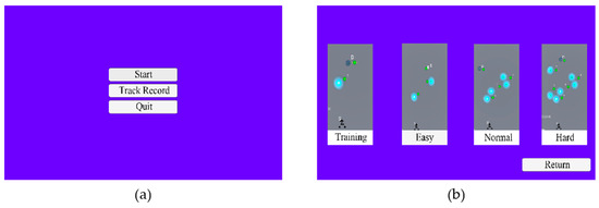 Initial interface of the UAV surveillance task simulation. (a) illustrates the initial interface for starting or quitting the experiment and viewing results; (b) shows the screen where participants can choose between training or tasks of various difficulties.