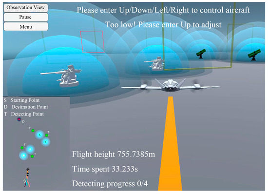 The experimental setup consisted of a Windows 10 operating system, a 24-inch monitor with a 144 Hz refresh rate and a resolution of 2048 × 1080, and external wireless input devices including a mouse and a keyboard. Participants used the keyboard arrow keys to control the manned aerial vehicle (MAV). The experiment was conducted in a closed room, where a non-intrusive instructor was present to provide background information, ensure adherence to the experimental procedure, and assist without influencing the participants’ actions or decisions.