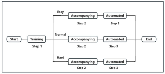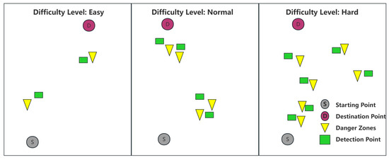 This study involved participants who were novices in human–robot interaction (HRI) experiments. To ensure the randomness and fairness of the experimental procedure, participants were randomized into three groups, each assigned a specific task difficulty level with no overlap in tasks. At the beginning of each session, the layout of detection points and danger zones was shuffled.