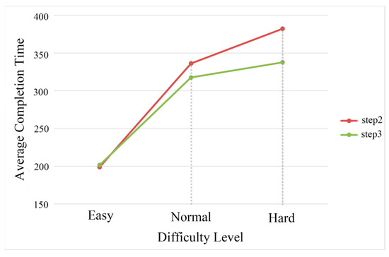 Every participant successfully finished every step of the experiment and chose the autonomous UAV surveillance option during Step 3. In Figure 7, we present a comparison of the average time participants spent completing tasks at various difficulty levels in both Step 2 and Step 3. In this figure, the vertical axis indicates the average time taken to finish the tasks, while the horizontal axis differentiates the task difficulty levels, i.e., Easy, Normal, and Hard. The red line corresponds to the average time for participants in Step 2, and the green line signifies the same for Step 3.
