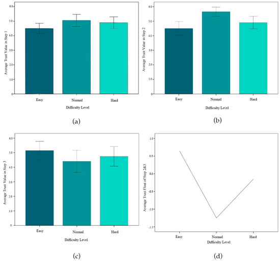 Figure 8 further elucidates the impact of task difficulty on trust levels. Figure 8a–c illustrate shifts in the average trust values across stages and varying task difficulties. In Figure 8a, before the experiment, the trust participants placed in artificial intelligence was consistent across all difficulty groups. However, during Step 2, those engaged in normal difficulty tasks exhibited higher average trust values than their counterparts in the easy and hard task groups. By Step 3, after experiencing HRI, the trust levels for the normal difficulty group declined, settling below the easy and hard task groups.