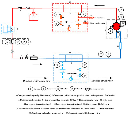 The compressor in this experimental setup is a variable-speed rolling piston compressor from Shanghai Hitachi, equipped with an internal gas–liquid separator. The compressor frequency can be set by a universal variable-frequency drive, with an adjustable frequency (f) range of 16.6 Hz to 120 Hz. The theoretical displacement volume V is 10.2 ml, and the compressor power consumption W is measured by a digital power meter. Both the evaporator and the condenser adopt compact brazed plate heat exchangers, where the heat exchange occurs between the refrigerant and the water. The refrigerant is R32, and the flow rate of the refrigerant, mr, is measured by a Coriolis flow meter. The temperature Tv and pressure Pv of the refrigerant before the electronic expansion valve can also be measured. The subcooling degree of the refrigerant is controlled by the constant-temperature water tank 5. The opening value of the electronic expansion valve is manually controlled by a stepper motor. The condensation and evaporation temperatures are controlled by automatically adjusting the heating power of the water bath in the cooling water and the chilled water circulation system. The volume flow rate of chilled water, qv,w, is measured by float flow meter 17, and the flow state of the refrigerant can be observed in sight glass 12.
