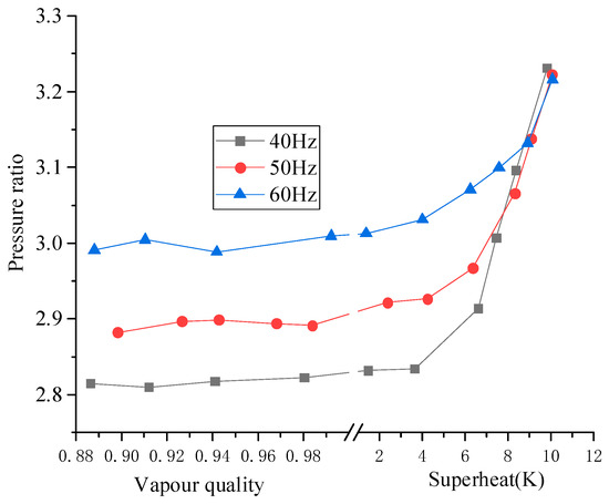 Figure 5. Verifying the change in compressor suction and discharge pressure ratio under different frequencies of working conditions.