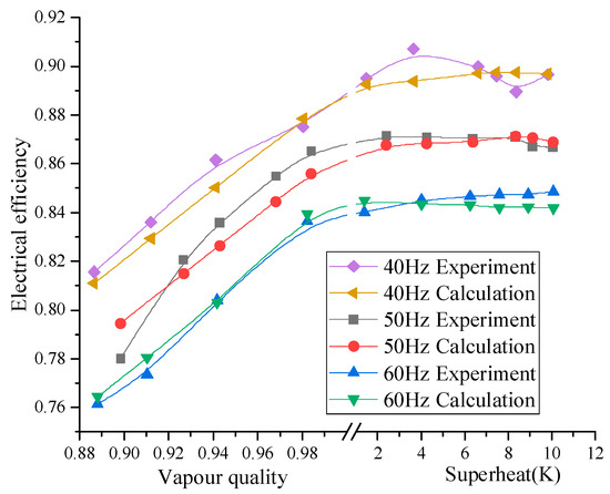 Figure 6. Experiment and calculation electrical efficiency at 40 Hz/50 Hz/60 Hz compressor frequency.