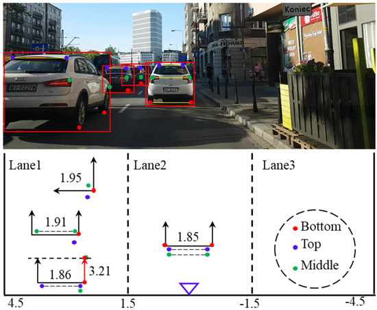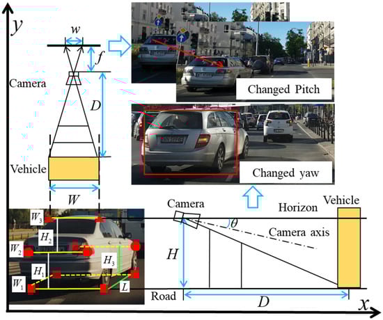 Deep learning has made significant strides in enhancing the reliability and precision of 2D object detection, as highlighted in recent studies [1,2,3,4,5,6]. Concurrently, the field of frontal vehicle detection in driving videos has witnessed remarkable advancements [7,8,9]. The R−CNN series is a typical two−stage method. R−CNNs [6] consist of region proposal generation (by selective search [10]), feature vector extraction, candidate region classification, and bounding box refinement. Fast R−CNNs [11] introduce a region of interest (ROI) pooling layer to produce a fixed−length feature vector. Nonetheless, relying solely on pixel coordinates for unmanned vehicle environment perception proves insufficient. To facilitate accurate route planning, an autonomous driving system must possess knowledge of both the relative distance and the orientation of surrounding vehicles. In real−world driving scenarios, several obstacles persist in accurately estimating the pose of frontal vehicles through monocular video analysis. Challenges persist due to factors such as shadow interference and mutual occlusion between vehicles, often resulting in a blurred or obscured target reference area. Additionally, vehicles traversing uneven terrain can lead to unexpected changes in the camera’s pitch angle, consequently disrupting the measurement model. Furthermore, the wide variation in vehicle widths poses a challenge to the stability of triangulation−based ranging methods.