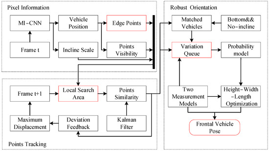 The comprehensive framework for vehicle pose estimation is depicted in Figure 2. The process consists of three subsystems: pixel information, point tracking, and robust orientation. The pixel information subsystem represents the extraction of information such as vehicle position and edge points from video frames. The point tracking subsystem is used to identify and track the movement of feature points on the vehicle over time. The robust orientation subsystem is used to evaluate and determine the direction of vehicle travel. The first process commences with the utilization of the convolutional neural network (MI−CNN) operating within a two−step detection paradigm, wherein it takes the initial frame (t) as input. This network serves a multi-faceted purpose: It simultaneously forecasts the positions of all vehicles along with their respective yaw angles relative to the host vehicle. Additionally, it is entrusted with the task of ascertaining the coordinates of edge points within the context of each vehicle’s 2D bounding box while also evaluating their visibility. The subsequent stage unfolds in frame t + 1, whereby the local search area for each vehicle is generated via a maximum displacement prediction model, incorporating an auxiliary variable. Within this search area, a fusion of edge point similarity and Kalman filter−predicted values is employed to align with the target vehicle. This matching process is instrumental in refining the redundant variable using the outcomes obtained from the match. Following the persistent tracking of the target vehicle for a span exceeding 10 frames, vehicles devoid of inclination are enlisted to compute a sequence detailing changes in distance. This sequence is established using the bottom edge as a reference point. The stability of this sequence is evaluated by means of a Gaussian distribution, which is applied with a fixed vehicle width. Once this distribution attains a state of stability, the structural parameters of the target vehicle can be refined using the aforementioned distance sequence. Consequently, this refined information facilitates the estimation of the vehicle’s pose.