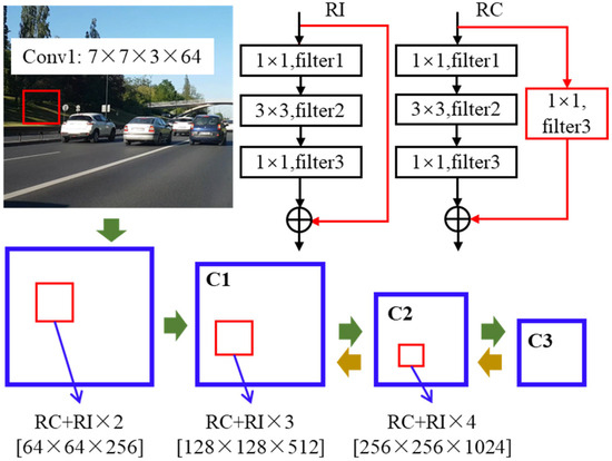 The initial layer of the network employs 7 × 7 × 3 × 64 convolution kernels with a stride of 2. Following batch regularization and pooling, it generates the initial features. Subsequently, the second layer incorporates one RC model and two RI models, each comprising a convolution kernel count of [64, 64, 256]. This stage yields a feature map denoted as C1. Advancing to the third layer, an additional RI model is introduced, increasing the convolution kernel count to [128, 128, 512]. The resultant output at this stage is marked as C2. The fourth layer incorporates another RI model while doubling the convolution kernel count to [256, 256, 1024]. Given that the feature scale has been reduced to a quarter of its original size, it becomes imperative to append a sufficient number of extraction channels to ensure the preservation of image details at all levels. The resultant shared feature map at the apex of the hierarchy is designated as C3. The ultimate step involves the combination of vehicle feature maps from distinct levels, achieved through the up−sampling operation. This amalgamation caters to the varied feature−level requirements inherent in each task.