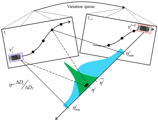 Probabilistic estimation of distance variation ratio for vehicle in the reference variation queue from r. The valid distance and have a similar ratio between reference frames t and t + k. The frames are the vehicle cut−in process in a pose state between reference frames t and t + k.